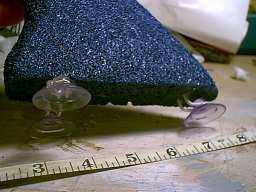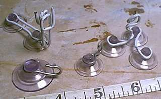 Extreme closeups of the suction cups and monofilament guides made from coat hangers and suction cups.