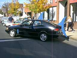 The car is a 1994 Saab 900 SE Turbo. Since it is a daily driver, the modifications necessary to make the Shark Car were temporary. This was originally built for the 2000 Mystic River Fish Parade. The car was well received. The only failure was when the left hand side fin control line came undone from the roof about 80% through the parade. Additional ideas would be to have some sort of moving mouth on the hood, moving gills, and/or the theme to "Jaws" on a tape or CD to make a more multimedia presentation.