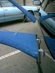 Details on the Shark Car. Left: Suction cups on the sunroof connect to monofilament (fishing line), routed through coat hanger wire and suction cup guides. Right: Hinges on the styrofoam fins, also made out of coat hangers epoxied to the fins.