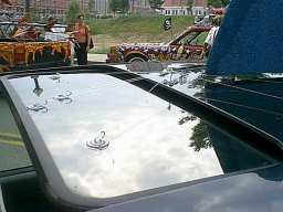 The fins are styrofoam, roughly cut with and X-acto knife and sanded. Then they were painted with regular household latex paint. Suction cups were used to attach the fins to the car. The connection between the suction cups and the fins were done with pieces of cut coat hanger, epoxied into the fin base. By attaching monofilament to the fins and routing them to the sunroof, the fins were made to deploy when the sunroof opened up. The hood was covered in paper, cut to size, then finished by painting with latex paint. Contact paper was used for the teeth and for the fish on the rear windows. The Shark Car is a temporary art car, but can achieve speeds of up to 20 mph without any deleterious effects. Details on the mechanism are shown below.